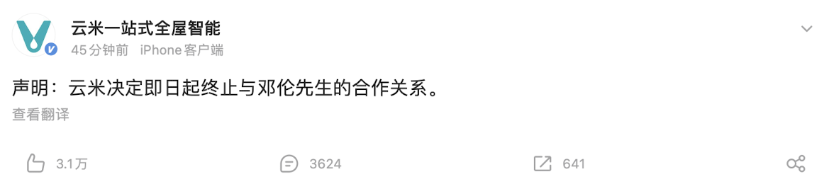 去年 9 月,云米宣布鄧倫為其全球品牌代言人。