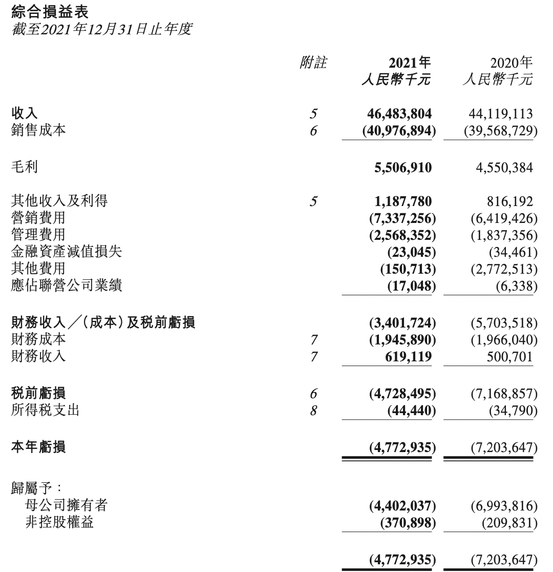 速途網4月1日訊(報道:喬志斌)日前,國美零售(0493.HK)發布了2021年財報。財報顯示,2021年,國美零售實現營業務收入464.84億元,同比增長5.36%;綜合毛利約為66.95億元,同比增長約25%,歸屬于母公司擁有者應占虧損約為人民幣 44 億元,同比收窄 37.06%。