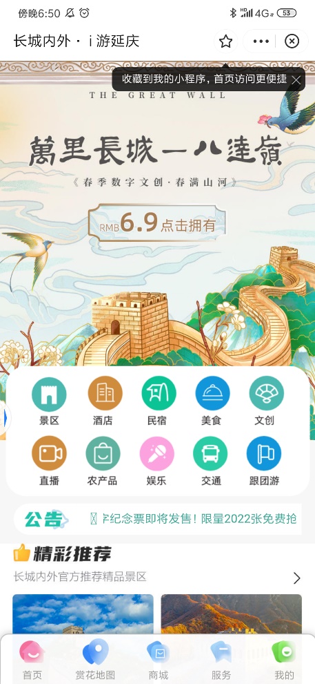 繼2022冬季紀念票之后,近日,八達嶺長城又上新春季特別款數(shù)字文創(chuàng)《春滿山河》,游客進入“長城內(nèi)外·i游延慶”支付寶小程序即可購買。