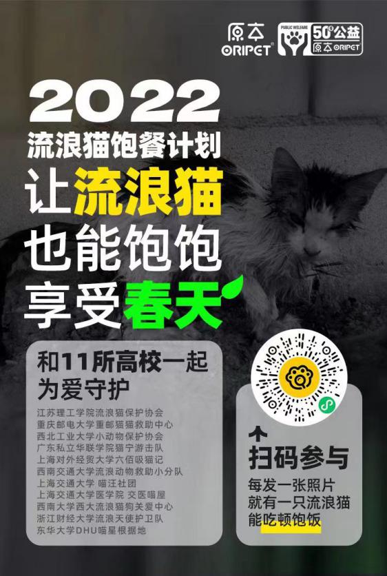 這一次,我們聯(lián)合知名寵物自媒體「貓來了」,共同發(fā)起?#原本50g公益·流浪貓飽餐計(jì)劃#公益活動(dòng),計(jì)劃為全國11所高校捐出總計(jì)1000kg原本貓糧。春日陽光明媚,我們希望高校里的流浪貓們,能夠吃得飽飽得享受這個(gè)春天。