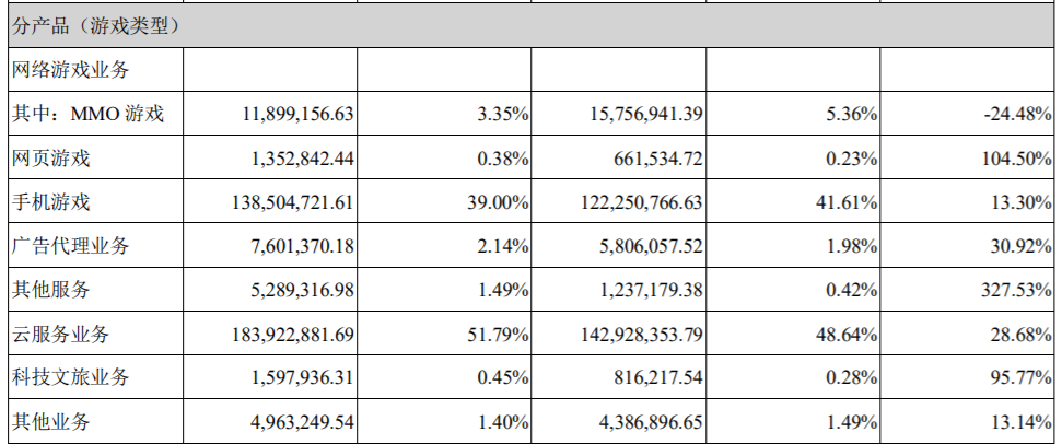 從各產品類型分類來看,網絡游戲業務中手機游戲營收去年全年營收為1.39億元占比總營收39%;云服務業務為主要支柱業務,營收為1.84億元,占比總營收的51.79%。