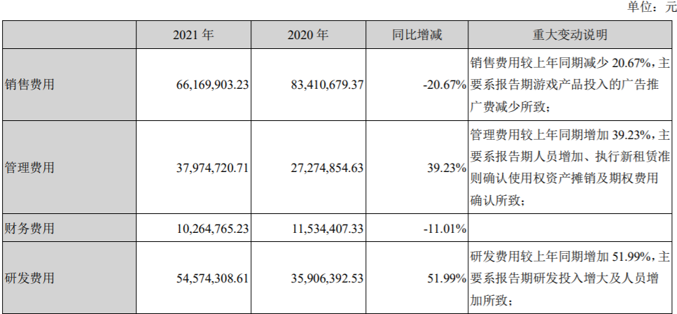 從四項費用來看,2021年銷售費用0.66億元,同比降低20.67%,中青寶稱主要系報告期內游戲產品投入的廣告推廣費減少所致;管理費用為0.380億元,同比增加39.23%;財務費用為0.103億元,同比減少11.01%;研發費用為0.546億元,同比增加51.99%。