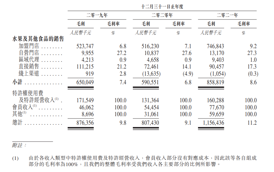 從收入類型來看,水果及其他產品銷售為百果園的核心收入來源,該部分收入在2021年占比達到了97.1%,對于該部分收入2021年相比于2020年增長,百果園稱這是由于凈增加了362家自行管理的加盟門店以及線下零售門店銷售額的復蘇所推動。但會員費收入自2019年逐年增長,2021年該部分收入為7767萬元。
