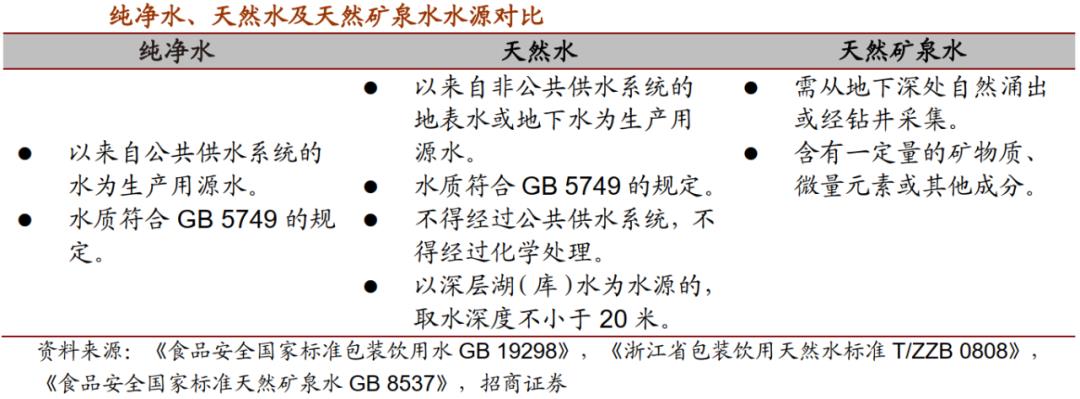目前市場上的瓶裝水主要分為礦泉水、純凈水和天然水,三者的差異在于水源。《包裝飲用水食品安全國家標準GB 19298》指出,純凈水和天然水以地表水為主,主要來源是公共供水系統及水庫、河流、湖泊等,而礦泉水水源則從地下深處自然涌出或經鉆井采集。