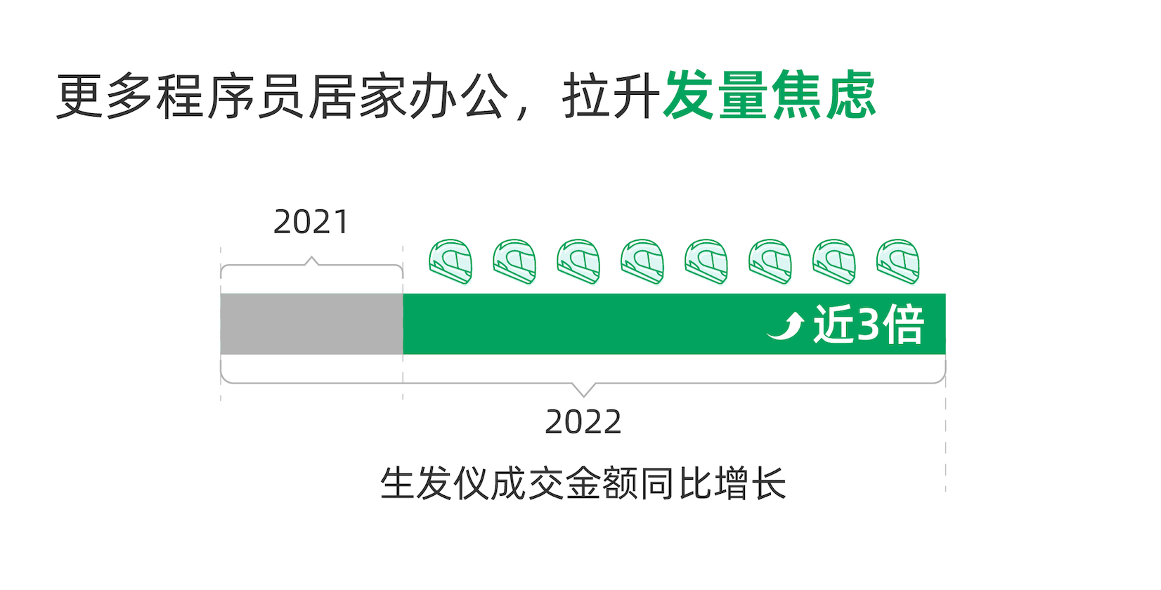 多日居家似乎也加劇了程序員們的發(fā)量焦慮。今年以來,天貓健康上生發(fā)儀成交額同比增長近3倍。