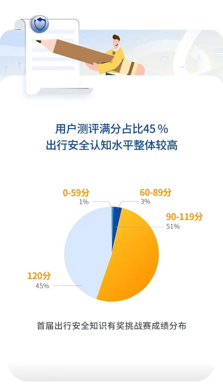 報告顯示,在參與測評的2萬余人中,獲得120分用戶占比45%,90-119分用戶占比51%,低于90分用戶占比僅約4%,呈現出行安全知識水平整體較高的特征。也從側面反映了,人們的出行安全意識和理念在不斷提升。