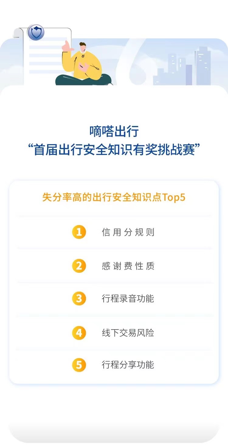 報告顯示,失分率高的出行安全知識點Top5分別是:信用分規則、感謝費性質、行程錄音功能、線下交易風險、行程分享功能。