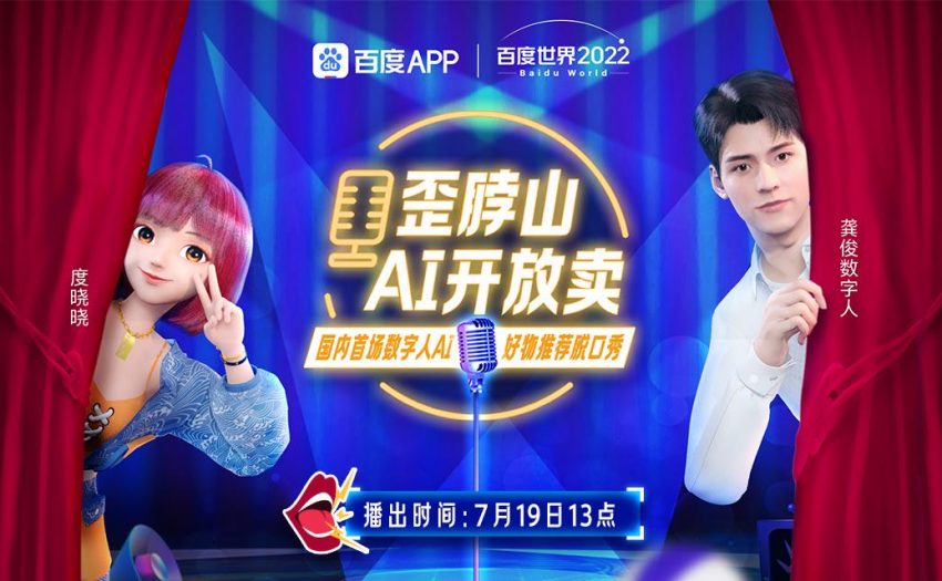 上述場景發生在2022百度世界大會前夕舉辦的“歪脖山AI開放賣”。7月19日,百度APP AI探索官度曉曉攜手龔俊數字人,作為首個數字人脫口秀帶貨主播,不僅把直播帶貨變成了一場“槽點滿滿”的脫口秀,還把帶貨內容卷到了“賣挖掘機”和在元宇宙“租地皮”的程度。