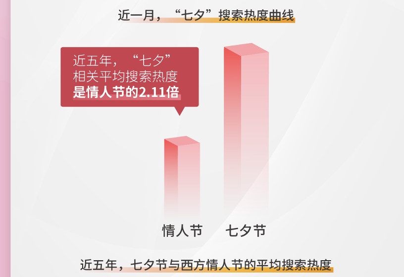 作為歷史長(zhǎng)河中經(jīng)歷“大浪淘沙”卻依舊留存至今的節(jié)日,七夕對(duì)于國(guó)人的影響甚至遠(yuǎn)超西方節(jié)日。根據(jù)百度大數(shù)據(jù)日前發(fā)布的“七夕消費(fèi)搜索大數(shù)據(jù)”中顯示,五年間,“七夕”相關(guān)內(nèi)容平均搜索熱度是“情人節(jié)”的2.11倍。可見(jiàn),國(guó)人對(duì)于“本土情人節(jié)”有著更多的關(guān)注。