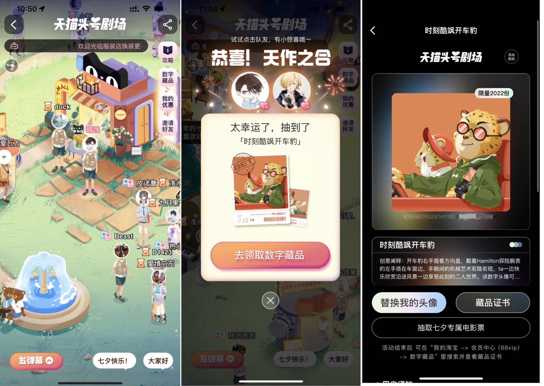 不僅如此,“元宇宙”虛擬空間也為品牌方提供了宣傳的陣地。速途元宇宙研究院注意到,針對(duì)七夕節(jié)日,天貓上線了“天貓頭號(hào)劇場(chǎng)”活動(dòng),聯(lián)合6大品牌,送上6組七夕限定數(shù)字藏品情侶頭像,為品牌露出創(chuàng)造了專(zhuān)屬的“元宇宙”場(chǎng)景。