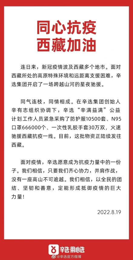 當前,西藏用于疫情防控的物資消耗較大,各界人士積極捐款捐物,共同打贏這場疫情防控攻堅戰。8月19日,據辛選集團官方微博消息,辛選集團創始人辛有志向援助西藏發展基金會捐贈一批抗疫物資。辛選迅速組織“辛滿益滿”公益計劃的工作人員,緊急采購防護服10500套、N95口罩666000個、一次性乳膠手套30萬雙等西藏急需物資,火速馳援。目前,這些物資正陸續發往西藏。