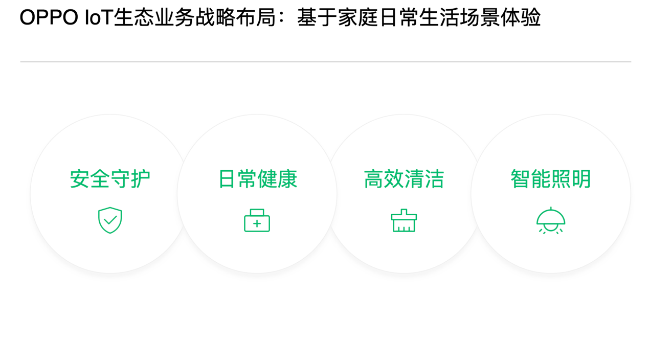 OPPO構建智慧生活以四個智慧場景為牽引,搭建了AIoT生態多圈布局。除自研入口級終端外,OPPO通過平臺云云對接的方式,與垂直品類頭部三方品牌共創無縫智慧互融體驗;同時在核心品類,采取與合作伙伴聯合研發的方式共同推出OPPO的生態選品。為了更深入走進用戶的日常生活,OPPO IoT生態業務聚焦家庭生活的高頻場景,歸納了安全守護、日常健康、高效清潔、智能照明四個子場景,并發布了系列新品,強化1個智能家庭空間的場景聯動體驗。