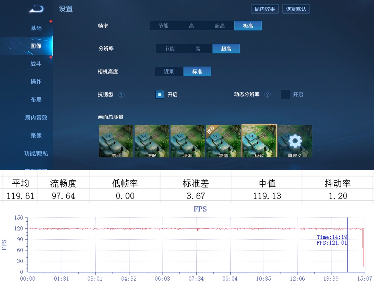 雖然《王者榮耀》并非對于性能要求極高的游戲,但在測試中,在開啟“極致畫質”以及“極高幀率”選項(最大120FPS),對于手機的性能依然有著不低的需求。在15分鐘的測試中,游戲能夠輕松保持在120FPS穩定運行(曲線圖波動為切換到結算畫面的幀率波動,與性能無關)。