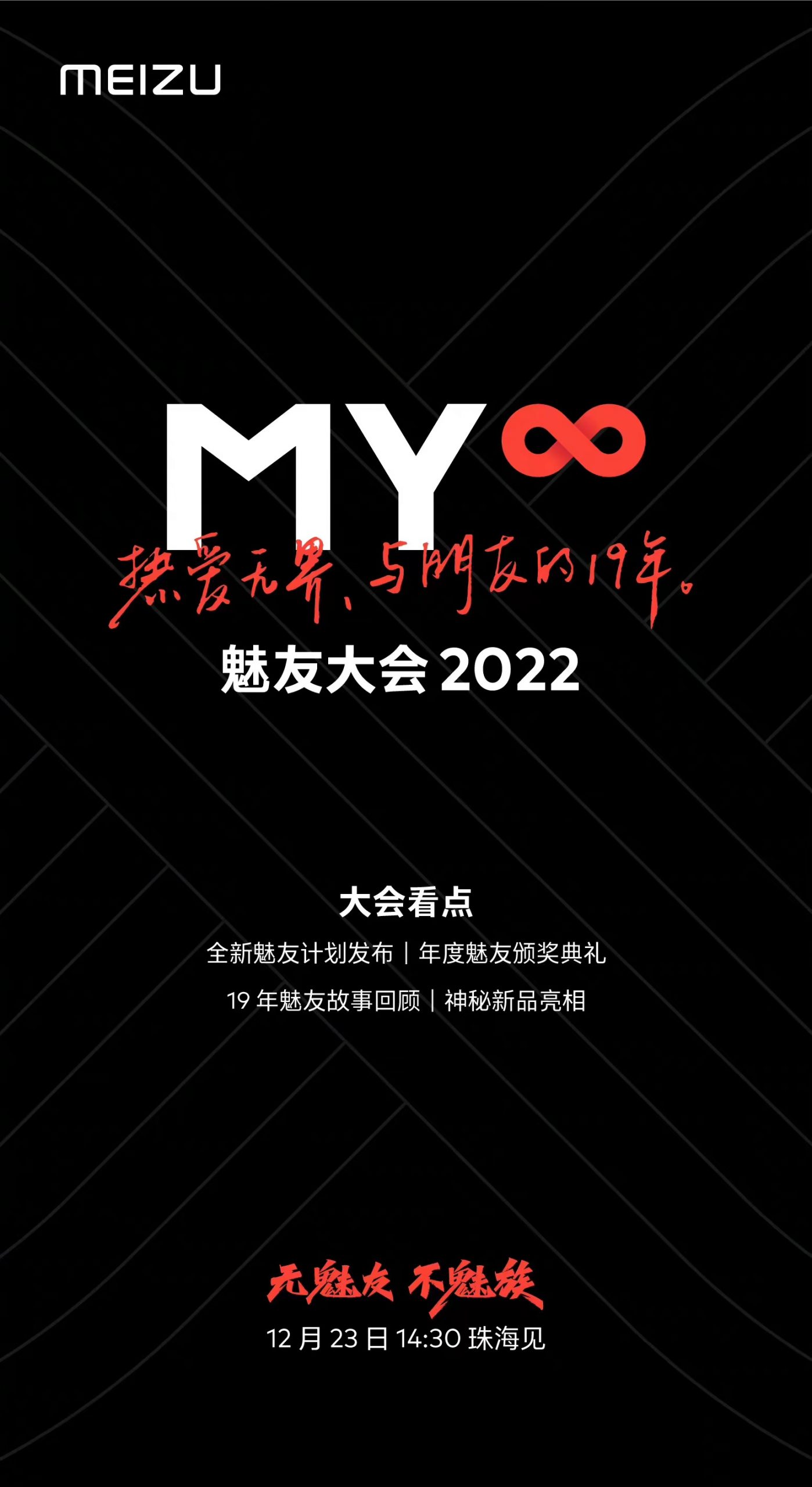 初心不移,好酒相迎。2022 年 12 月 23 日 14:30,魅族科技誠邀四海賓朋、八方魅友齊聚「魅友大會2022」,暢敘魅族與朋友的 19 年,見證神秘新品的亮相。