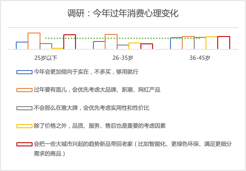 在購買品類方面,66%的36-45歲用戶表示購買的商品會與往年相同,這符合用戶消費的慣性;但同時,實用性和對于健康品類的需求也成為了主要的消費偏好,分別占比42%,和32%,反映出人們的消費需求日趨理性。值得注意的是,愿意購買趨勢新品(環保、綠色等)的用戶占比均有所提升,反映出人們對于提升家鄉生活條件有一定需求,這一品類仍有一定的上升空間。