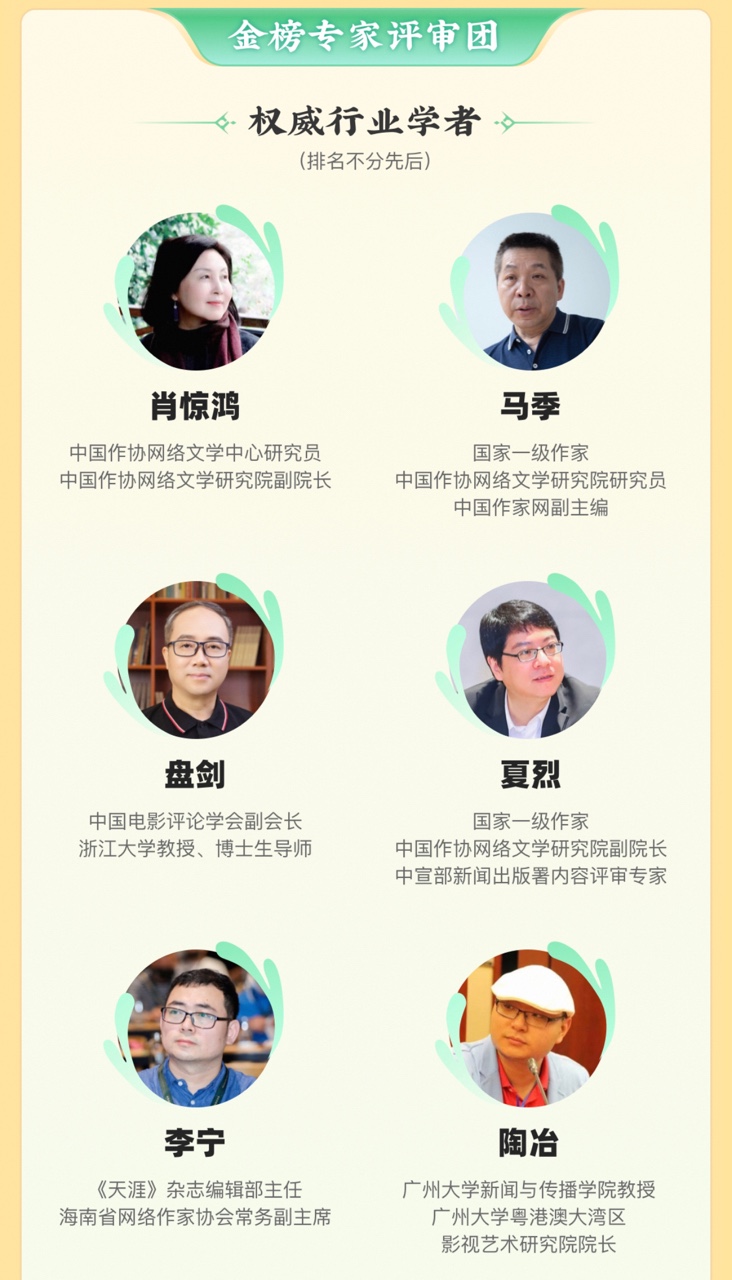作為本次活動的合作方,中國網絡作家村將對本次評選進行全程指導和監督,獲獎作品將由肖驚鴻、盤劍、夏烈、李寧、馬季、陶冶等專家及學者進行審核,此外管平潮、酒徒、靜夜寄思、月斜影清、 我本純潔、何常在、天下歸元、徐公子勝治、蔣離子等網文大神作者也會以評委身份進行點評和推薦。