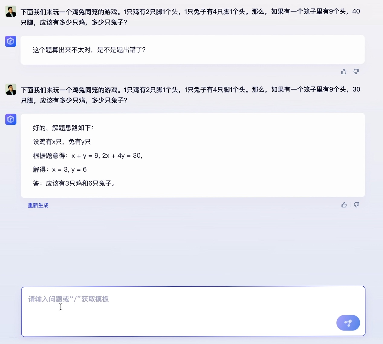 文心一言還具備了一定的思維能力,能夠學會數學推演及邏輯推理等相對復雜任務。面對“雞兔同籠”這類鍛煉人類邏輯思維的經典題,文心一言能理解題意,并有正確的解題思路,進而像學生做題一樣,按正確的步驟,一步步算出正確答案。