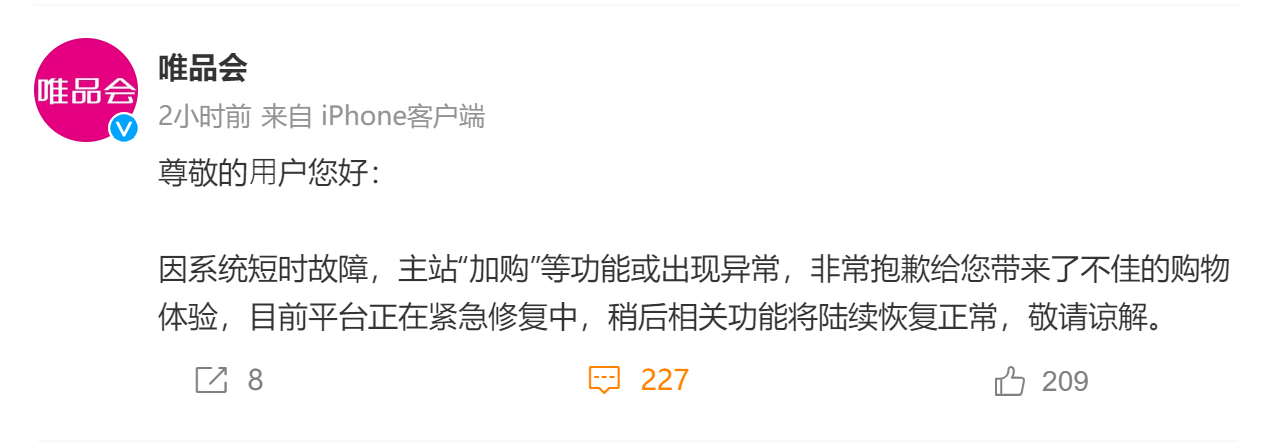 速途網(wǎng)3月29日消息(報道:李楠)今日,“唯品會崩了”登上微博熱搜。對此,唯品會回應(yīng)稱,因系統(tǒng)短時故障,主站“加購”等功能或出現(xiàn)異常,非常抱歉給您帶來了不佳的購物體驗,目前平臺正在緊急修復(fù)中,稍后相關(guān)功能將陸續(xù)恢復(fù)正常,敬請諒解。 ???