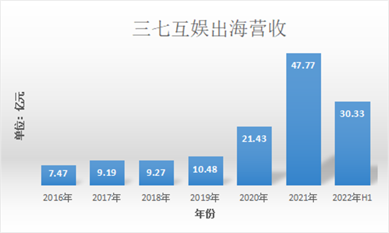 最近三年,三七互娛在海外市場的營收迎來新一輪暴增。財報顯示,2021年,三七互娛海外游戲業務收入47.77億元,較上年同期增長122.94%。到2022年年中,境外收入去到30.33億元,同比增長48.33%。出海收入已經是支撐三七互娛每年業績增長的基石。