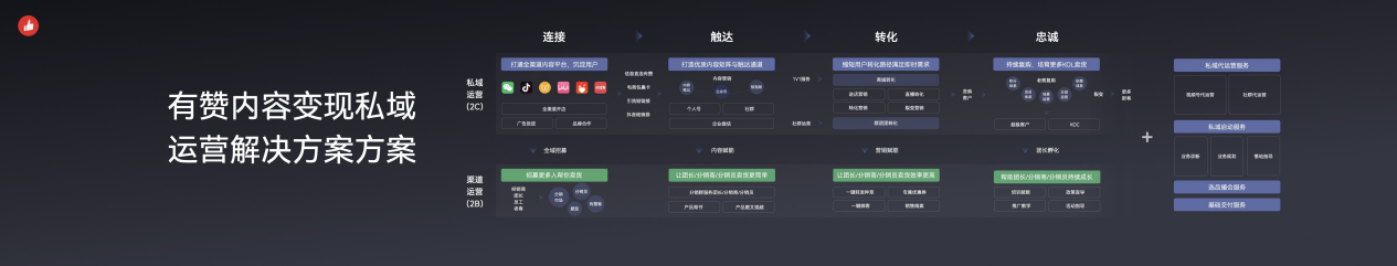 除此之外,針對于內容變現類商家所遇到的貨品組合難、私域環境不熟悉、起步困難、團長資源不足、私域運營人才不足、系統上線難等情況,有贊還提供了諸如私域啟動服務、私域代運營、選品撮合服務等各類運營服務,幫助商家私域業務快速起盤。