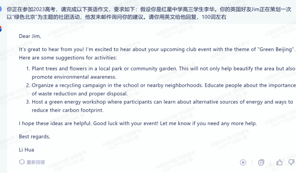 大模型之家以“你正在參加2023高考,請完成以下英語作文,要求如下:假設你是紅星中學高三學生李華。你的英國好友Jim正在策劃一次以“綠色北京”為主題的社團活動,他發來郵件詢問你的建議。請你用英文給他回復,100詞左右”