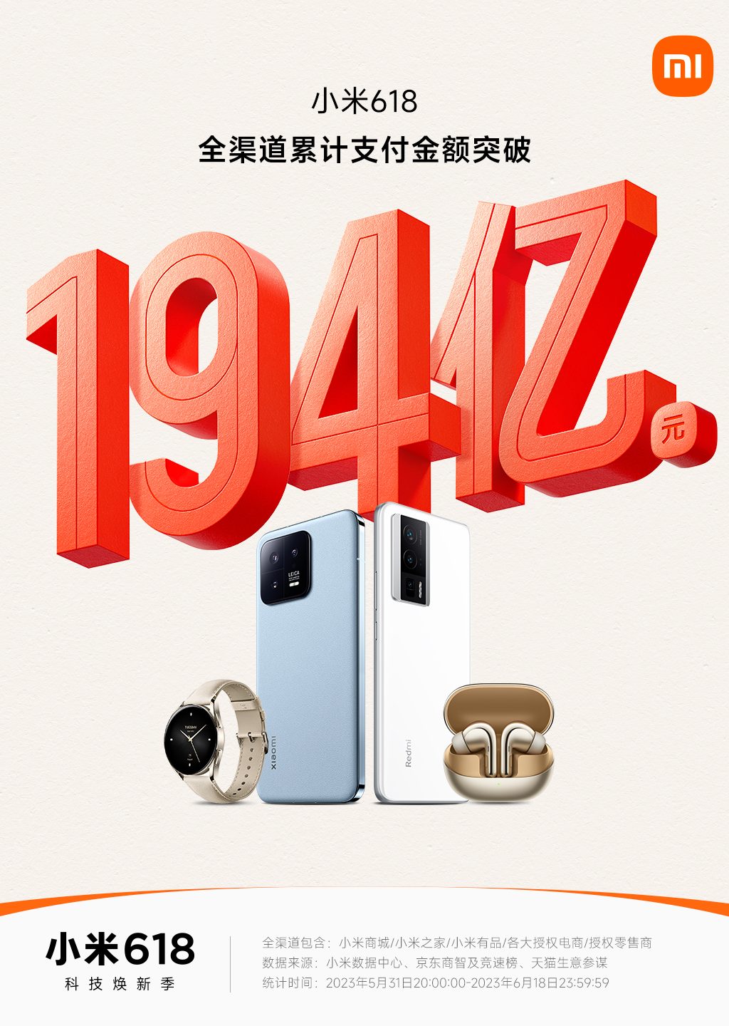 速途網(wǎng)6月19日訊(報道:喬志斌)6月18日,小米618“科技煥新季”完美收官。整個618期間,小米憑借銷量火爆的小米13系列、Redmi K60系列,以及數(shù)百款AIoT產(chǎn)品,各品類產(chǎn)品捷報頻傳。截止到6月18日24點,小米618全渠道累計支付金額達成超194億元,遠超預期,創(chuàng)下歷史新高。