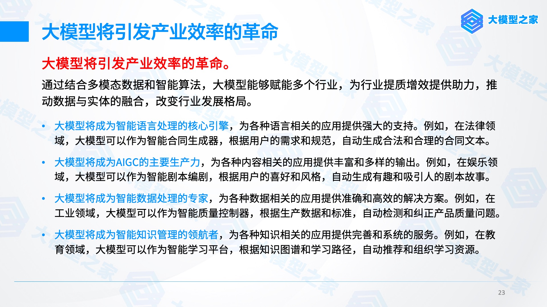 《報告》指出,大模型將引領產業的5大革命。基于深入研究,解析了人工智能大模型如何引領產業創新,提升企業競爭力,并推動社會進步。其細致入微的分析,廣泛的行業案例以及深刻的結論,旨在揭示AI大模型的商業價值和市場潛力。