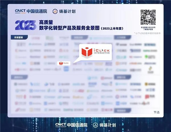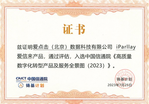 會上,信通院重磅發布《高質量數字化轉型產品及服務全景圖(2023上半年度)》。愛點擊憑借產品創新、數據安全、硬核技術等多方面的優異表現和助力企業數字化轉型的實踐成果,成功入選全景圖“市場營銷”核心板塊。旗下基于營銷自動化的增長專家iParllay愛信來實力通過“鑄基計劃”高質量數字化轉型產品功能測評,本次測評圍繞客戶中臺、營銷獲客、銷售管理、企微SCRM、微信公眾號SCRM、營銷自動化、數據分析、應用市場八大模塊進行,獲頒認證證書。