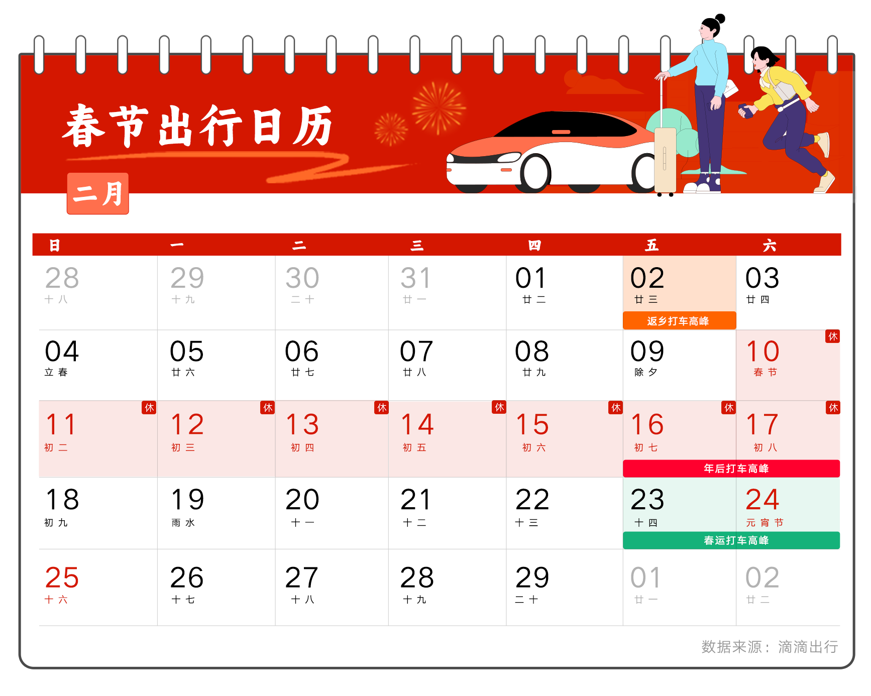 今年春運期間打車需求預計相比2019年同期增長40%。其中,2月2日起將提前進入返鄉叫車高峰,前往機場、火車站等大型交通樞紐的打車需求高峰將持續至2月7日,異地出行需求預計比2019年增長50%。與親友團聚的長假也充分釋放了玩樂出行需求,休閑娛樂場景的叫車需求預計增長80%。