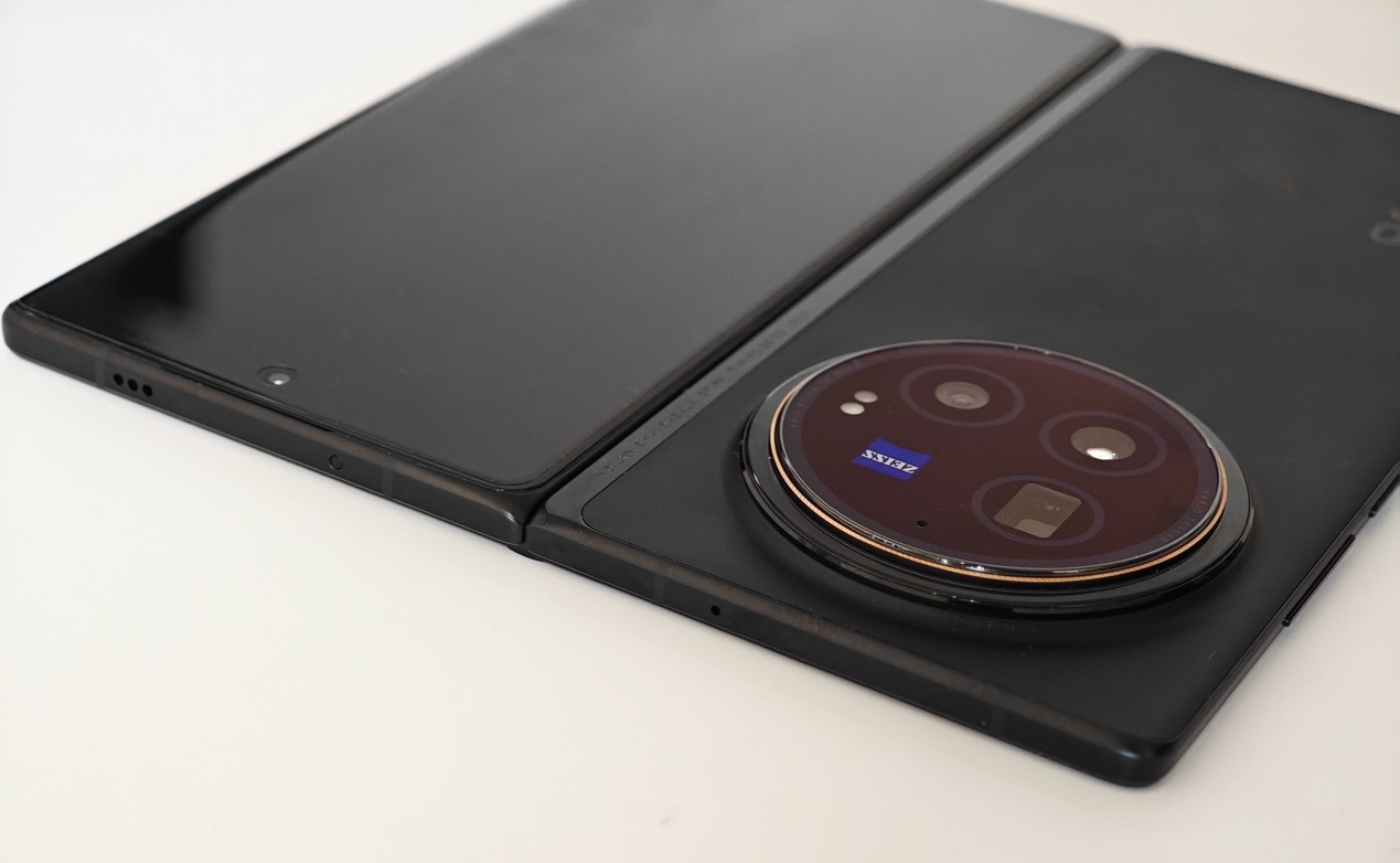速途網手中這臺vivo X Fold3 Pro為“薄翼黑”配色,意為“極致輕薄的黑,如黑夜蟬翼般靈動”。在低調內斂且不失奢華的黑色的面板上,圓形的影像Deco位于上端,在畫龍點睛般的金環包圍之下,猶如月全食下映出的光暈。內部不僅有這兩顆常規的廣角(主攝)與超廣角鏡頭,方形的開孔意味著前往長焦鏡頭在vivo X Fold3 Pro強勢回歸,這也為這款機型帶來更加全能的影像體驗。