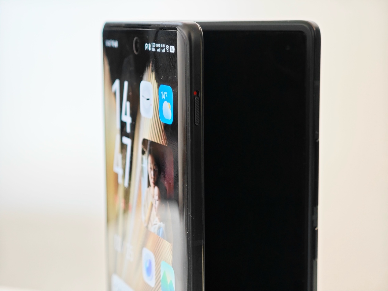 vivo X Fold3 Pro的中框采用直角過渡設計,讓整機的線條更加硬朗、收斂,也更加耐用。中框側面保留了靜音鍵的兩段式滑塊,能快速切換手機的響鈴/靜音模式。