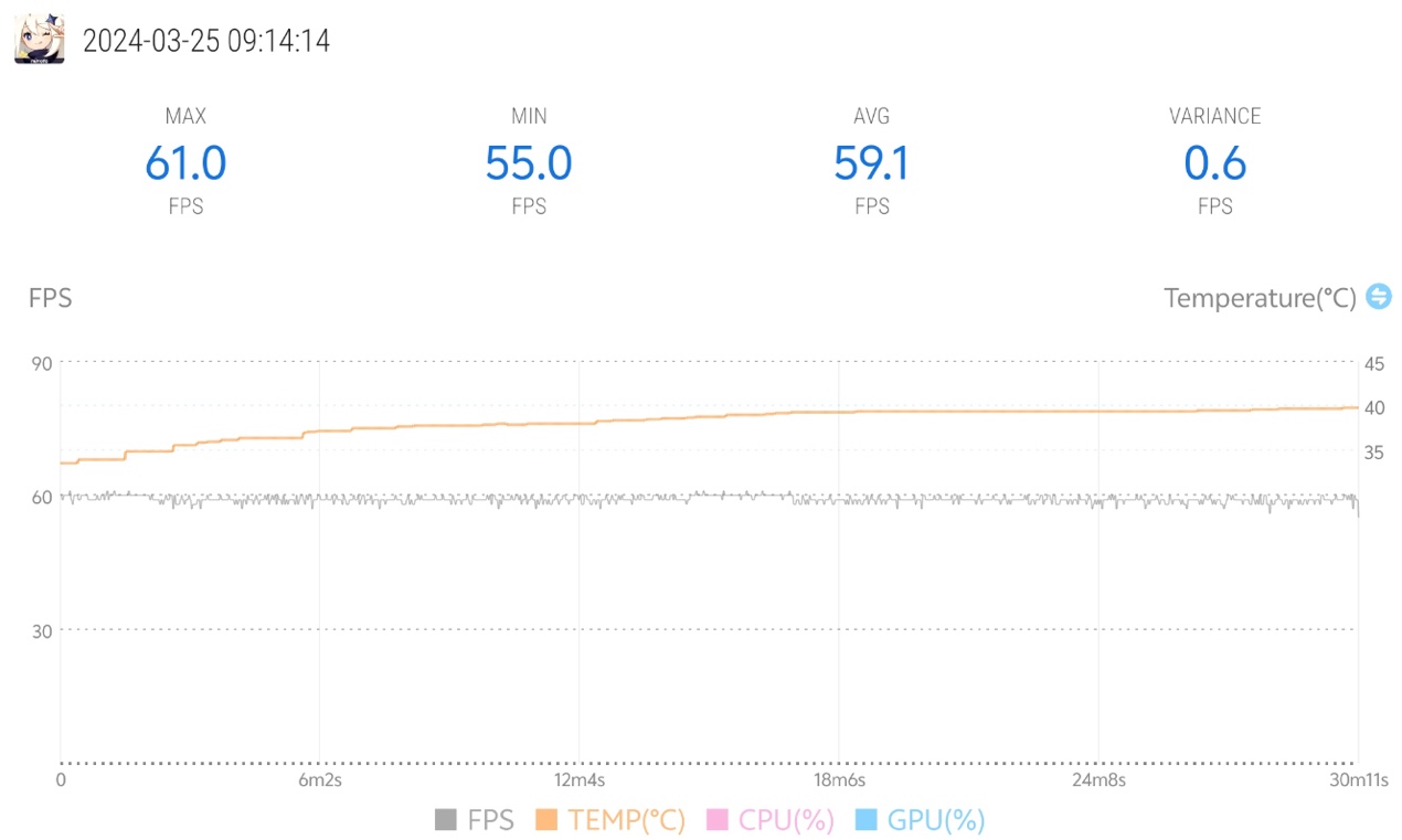 而在更高負載的《原神》測試環節,先將游戲內畫面設置調為“極高”,再手動將幀率調整到60FPS的模式,vivo X Fold3 Pro在30分鐘的游戲過程中,平均幀率維持在了59.1FPS,且幀率全程表現穩定。
