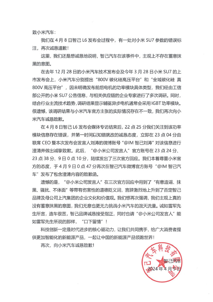 速途網4月9日消息(報道:李楠)剛剛,智己汽車再次針對發布會上對比小米汽車參數錯誤一事向小米汽車表達歉意。