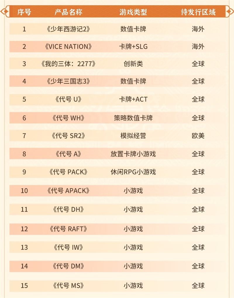 首款《三體》IP正版授權游戲《我的三體:2277》已開放預約,另有現代都市題材SLG《Vice Nation》、少年系列重磅新品《少年三國志3》、模擬經營全平臺游戲《代號:SR2》等產品儲備。此外在小游戲賽道上,《代號 A》《代號 Pack》《代號 DH》等也將陸續開啟測試,伴隨多款新品的陸續上線有望進一步撬動增長空間。