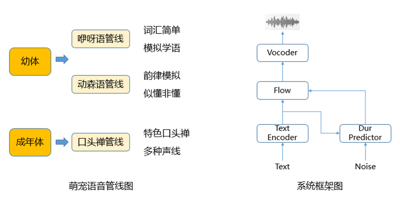 在音色方面,由AudioMaker語音合成系統提供支持。萌寵語音合成采用了結合變分推理和流模型的高表現力語音合成模型,能夠根據指定的情感標簽和文本,快速高效合成帶相應情感的語音。本次龍凰活動中,根據萌寵的養成階段分為幼體和成年體,對此,AudioMaker集成了一套萌寵語音合成管線,包括幼體階段的咿呀語管線、動森語管線,以及成年階段的口頭禪管線。其中,動森語管線的特點是在保留一定說話韻律的基礎上,營造似懂非懂的說話方式來表現幼體的年齡特性。