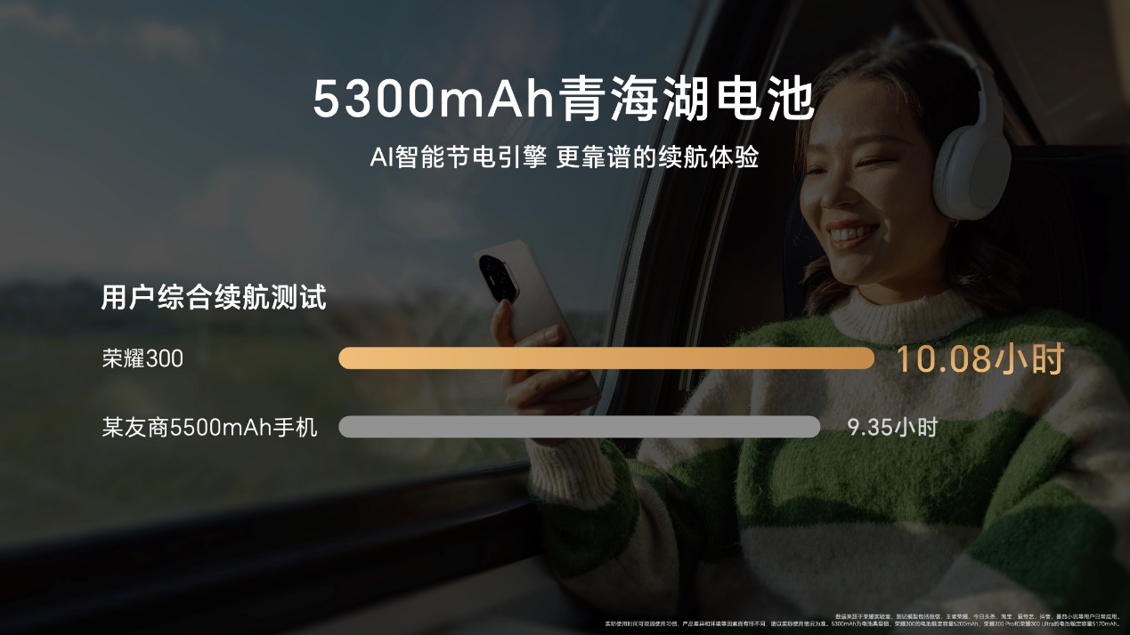 續航方面,榮耀300系列搭載青海湖高密度電池,擁有5300mAh的大容量,配合AI智慧節電引擎對非必要耗電應用的智能管控,帶來超長穩定的用機體驗。榮耀300系列支持最高100W有線充電,榮耀300 Pro和榮耀300 Ultra支持80W無線超級快充,同時還具備反向充電功能,滿足了不同場景下的充電需求。