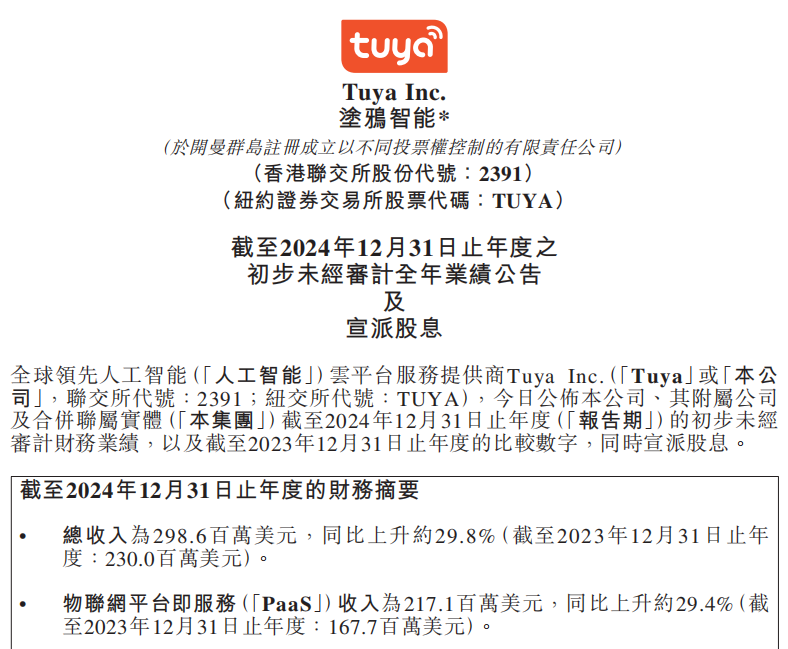 速途網訊 2月26日晚間,全球領先的人工智能云平臺服務提供商涂鴉智能(TuyaInc.,香港聯交所股份代號:2391;紐約證券交易所股票代碼:TUYA)公布了截至2024年12月31日止年度的初步未經審計全年業績。財報數據顯示,涂鴉智能在過去一年的業務發展呈現出一系列關鍵變化。