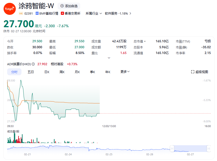 27日開盤,涂鴉智能港股(02391.HK)股價出現波動,截至中午休市,股價為27.7港元,較昨日收盤價下跌7.67%。有評論認為,股價的起伏反映出資本市場對涂鴉智能未來走向的持續關注與預期分歧。