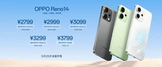 Reno14 提供人魚姬、半夏綠、礁石黑三種配色,12GB+256GB 版本:定價 2799元、國補價2379.15元,12GB+512GB 版本:定價2999元、國補價2549.15元,16GB+256GB 版本:定價 3099 元、國補價2634.15元,16GB+512GB 版本:定價 3299 元、國補價2804.15元, 16GB+1TB 版本(僅支持人魚姬、礁石黑配色):定價 3799 元、國補價3299元。