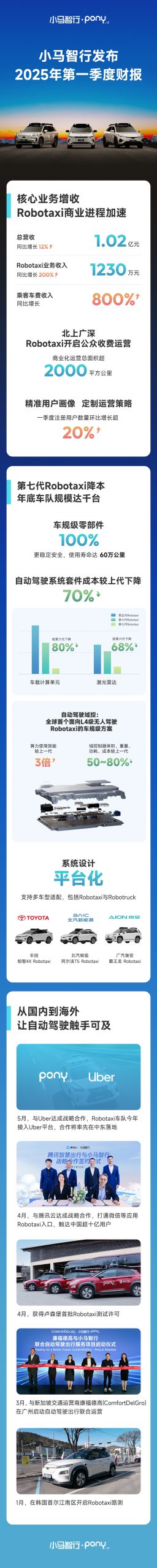 速途網(wǎng)5月20日消息(報道:李楠)今日,自動駕駛企業(yè)小馬智行(NASDAQ:PONY)發(fā)布未經(jīng)審計的2025年第一季度財報。財報顯示,小馬智行第一季度總營收為1.02億元(1398萬美元),同比增長12%;其中Robotaxi業(yè)務(wù)收入達1230萬元(173萬美元),同比增長200%。截至一季度末,現(xiàn)金等價物及長短期理財投資總額為53.59億元(7.39億美元)。