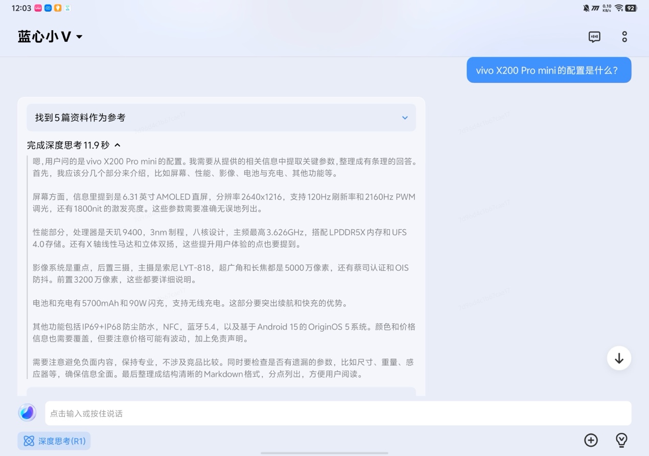 最為值得關(guān)注的是AI助手“藍(lán)心小V”的引入,它不僅支持語音交互,更整合了DeepSeek深度思考與聯(lián)網(wǎng)搜索能力,在復(fù)雜問題的解答、實(shí)時(shí)信息獲取方面較傳統(tǒng)語音助手更進(jìn)一步。