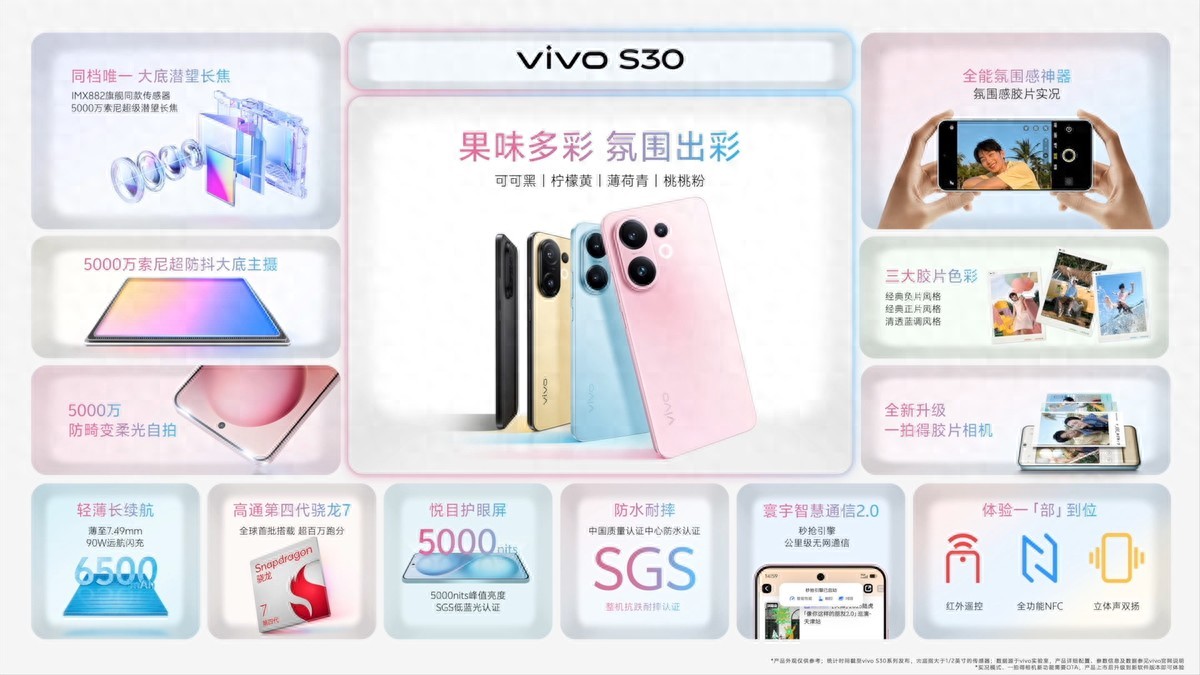 速途網5月29日(報道:喬志斌)今日晚間,vivo正式發布vivo S30系列新機。作為vivo美學旗艦的又一匠心之作,vivo S30系列選擇了大膽創新的撞色設計,擁抱年輕人多元開放的價值觀,在影像上引領當下流行的“氛圍感”審美和live需求,加入多樣趣味功能,更在產品綜合體驗上進行了全面升級,整體打造旗艦級的用戶體驗。vivo S30系列現已開啟預售,并將于6月6日正式開售。