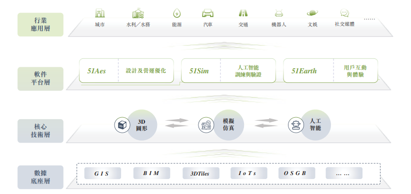 經過多年的發展,51WORLD已經構建了三級增長曲線,形成了51Aes數字孿生平臺、51Sim合成數據與仿真平臺及51Earth數字地球平臺三大核心業務。這些業務覆蓋了城市、水利、能源、汽車、交通、機器人、娛樂等多個領域。