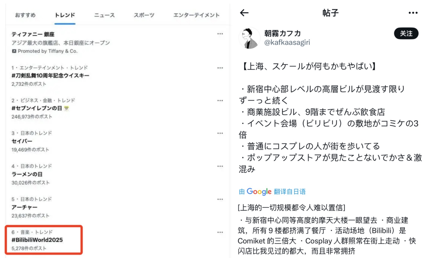國際化是今年BW的一大亮點,不僅是展商國際化、同時還有到場觀眾的國際化。今年共有來自20多個國家及地區的觀眾參展,護照購票用戶占比達13%,除了日本、韓國二次元濃厚的周邊國家,甚至有來自俄羅斯、巴西、沙特、埃及等國的二次元粉絲前來參展?;顒悠陂g,BW話題空降日本推特熱搜第6位,眾多海外用戶驚嘆于BW的規模之大,活動之多。日本知名漫畫家、《文豪野犬》作者朝霧卡夫卡參展后,稱“一切規模都令人難以置信”。