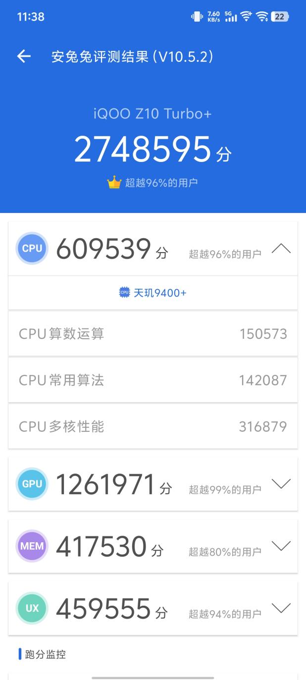 先看性能硬數據:安兔兔實測超?274萬+分,Geekbench 6?單核約?2641、多核?8273,妥妥的第一梯隊水平,這成績也實實在在體現出天璣?9400+?的旗艦芯實力。