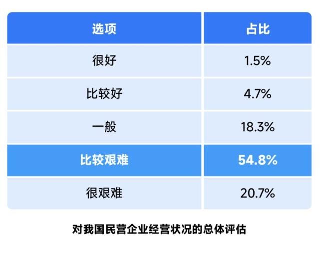 對當(dāng)前我國民營企業(yè)的總體經(jīng)營狀況,54.8%的受調(diào)企業(yè)認(rèn)為比較艱難,20.7%的企業(yè)認(rèn)為很艱難,合計為75.5%,對比2024年11月806家企業(yè)問卷調(diào)查中,對總體經(jīng)營狀況評價為很艱難和比較艱難占52.6%,明顯低于本次。