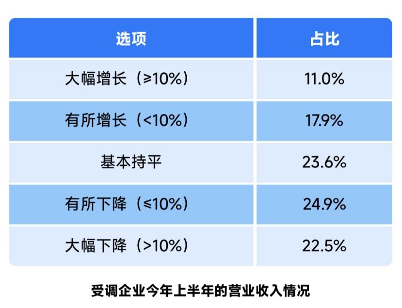 受調(diào)企業(yè)中,2025年上半年營收增長的占28.9%,其中增幅超過10%的企業(yè)占11%;基本持平的占23.6%,營收下降的企業(yè)占比47.4%,其中降幅超過10%的占22.5%。