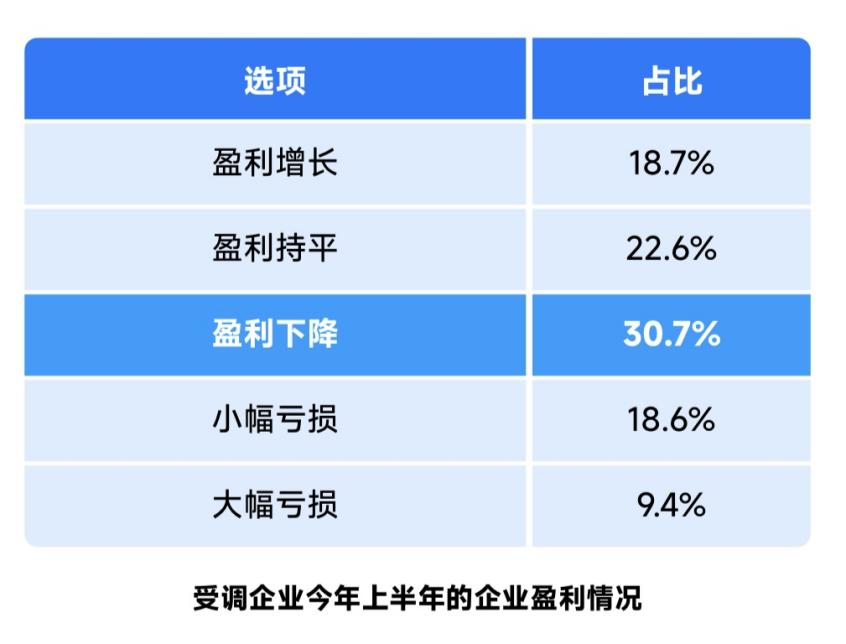 受調(diào)企業(yè)中,上半年盈利增長的占18.7%,低于營收增長的企業(yè)占比(28.9%),說明企業(yè)增收不增利的現(xiàn)象仍然存在,盈利持平的占22.6%,盈利下降的占30.7%。
