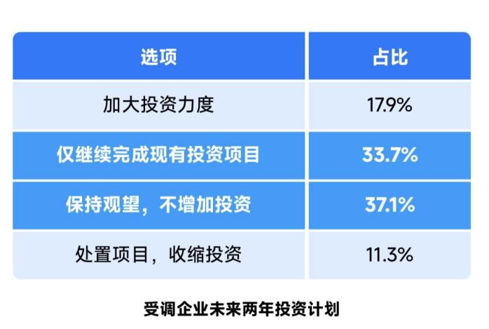 問卷顯示,受調(diào)企業(yè)未來兩年投資計劃中,有17.9%的企業(yè)選擇“加大投資力度”,“保持觀望,不增加投資”的占比為37.1%,“僅繼續(xù)完成現(xiàn)有投資項目”占33.7%,兩者合計占70.8%,反映出大部分企業(yè)謹(jǐn)慎的投資態(tài)度,11.3%的企業(yè)選擇“處置項目,收縮投資”。