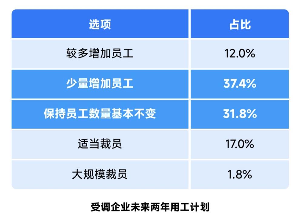 問卷顯示,企業(yè)計劃增加用工的占49.4%,其中12%的企業(yè)選擇“較多增加員工”,31.8%的企業(yè)選擇“保持員工數(shù)量基本不變”,選擇裁員的企業(yè)占18.8%。